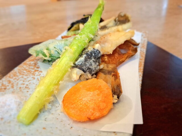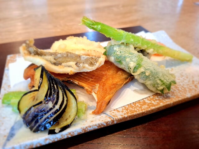 (天麩羅)平目磯辺揚げ、目高、茄子、人参、あすぱら、岩塩