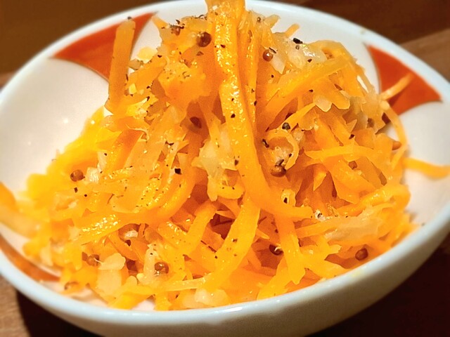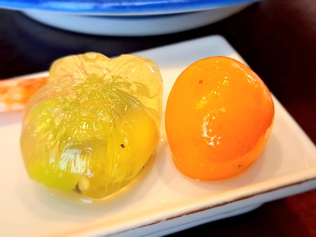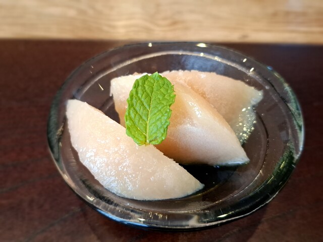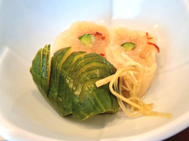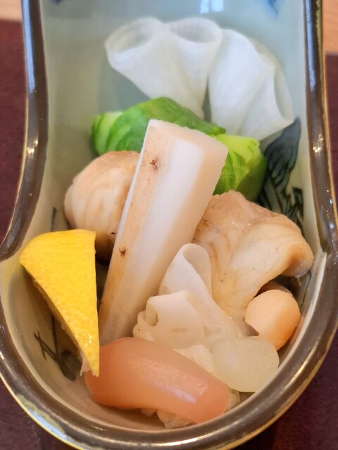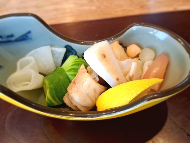 (酢の物)平目南蛮漬け、蛇腹胡瓜、玉人参、朝瓜、鉄扇長芋、れもん