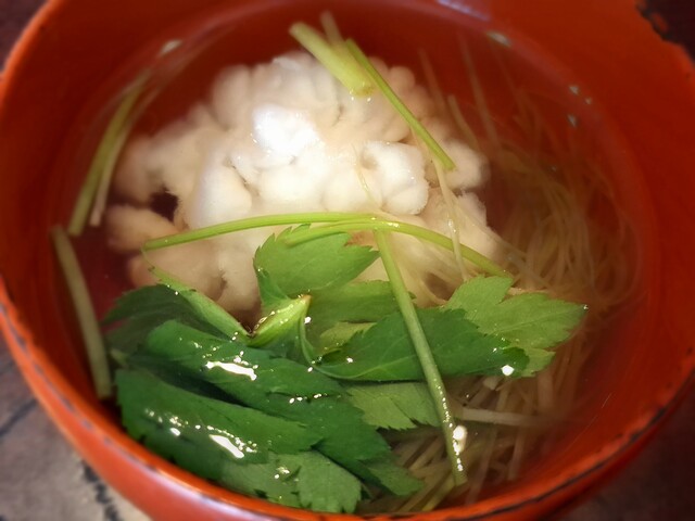 (吸い物)澄まし汁仕立て鱧葛叩き、糸あすぱら、三つ葉、針山葵