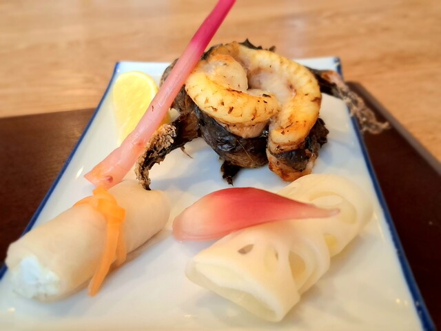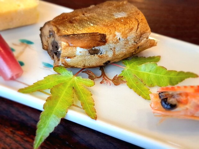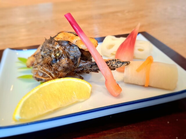 虎魚塩焼き、鯒奉書巻き、蛇籠蓮根、酢取り茗荷、れもん、懐式