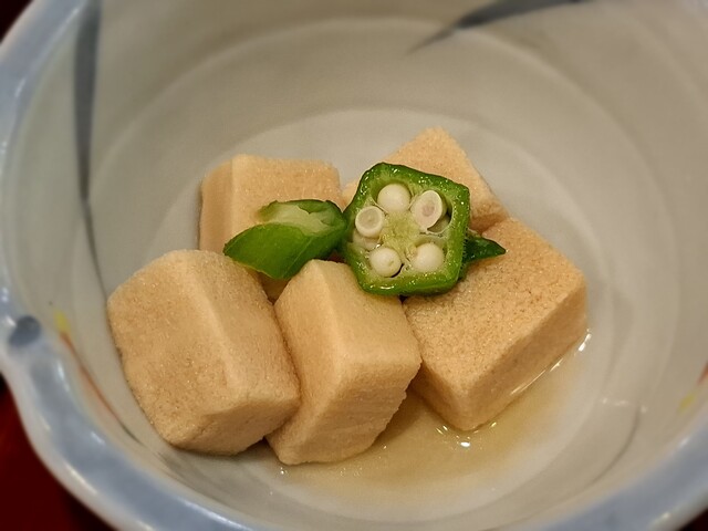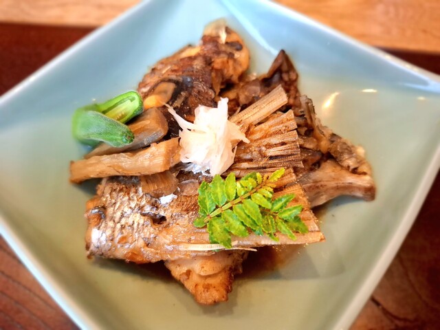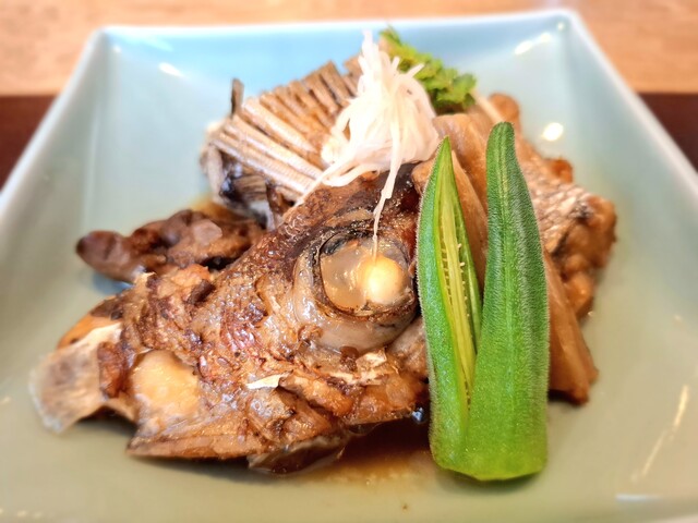 (煮物)鯛頭あら炊き、おくら色煮、針生姜、木の芽