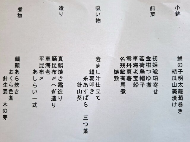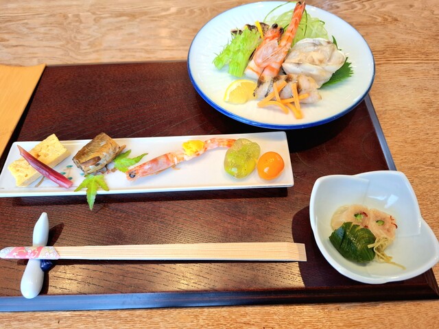 真鯛焼き霜造り、鯒昆布〆へぎ造り、車海老、平昆布〆あしらい一式